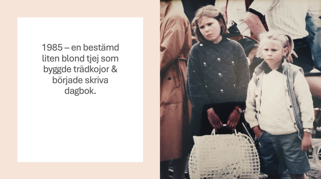 Själv var jag en bestämd unge som gillade att bygga trädkojor och gömma mig i bergen bakom stugan. Där skapade jag små världar, pratade med myror och letade efter skatter. Min favoritglass var Nogger, och på 80-talet kostade en glass i kiosken bara fem kronor. För tio öre kunde man köpa skitlortar, eller kanske hette de harlortar, nu när jag tänker efter.