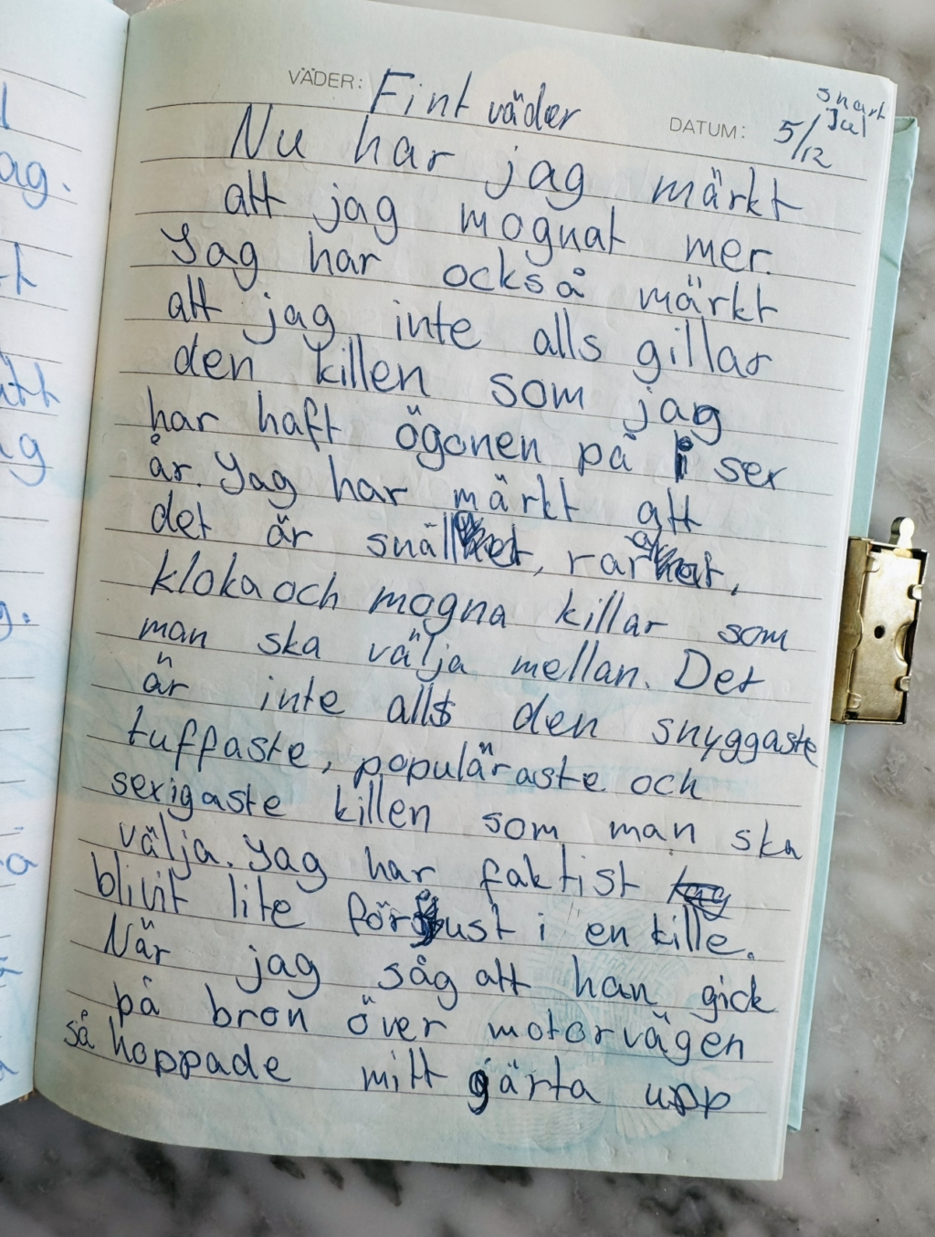 Jag slutade skriva dagbok sommaren mellan nian och gymnasiet. Jag blev kär i en kille som var fem år äldre. Han tvingade mig att visa mina dagböcker och rev ut sidorna där jag skrivit om mina barndomsförälskelser.