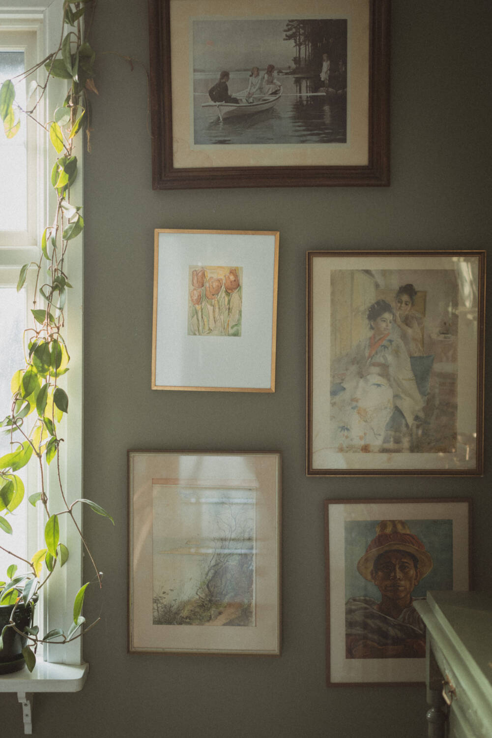 Jag har varit ute på siterna för att klicka hem en oljemålning likt min moodboard nedan. Det kommer säkert ta tid innan jag finner någon jag gillar och till rimlig prisklass så akvareller med röda tulpaner och vit bred passpartout tror jag får vara kvar så länge. Men annars ryker denna tavelvägg.
