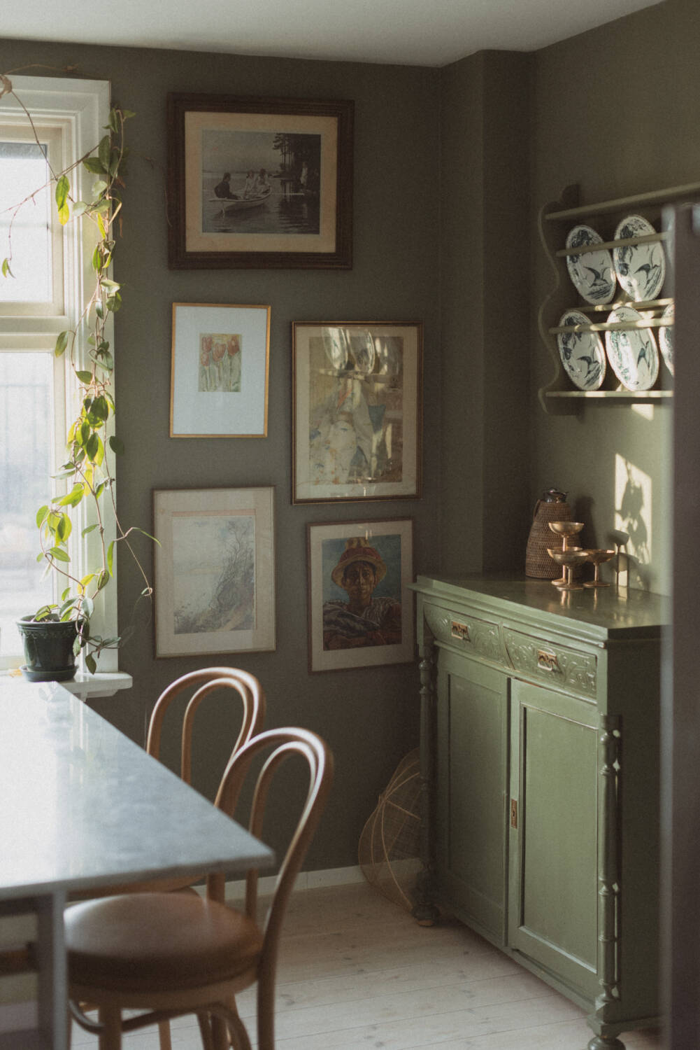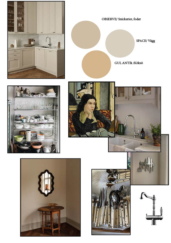 Det verkar som att vi börjar i köket. Där är grönt och rätt så burrigt. Även om solen kikar in på kvällskvisten så är det rätt mörkt och litet här inne. Min man gillar varken tallrikshylla eller gamla ommålade byråer så dessa ska ut och vi ska försöka skapa lite mer bistrokänsla.