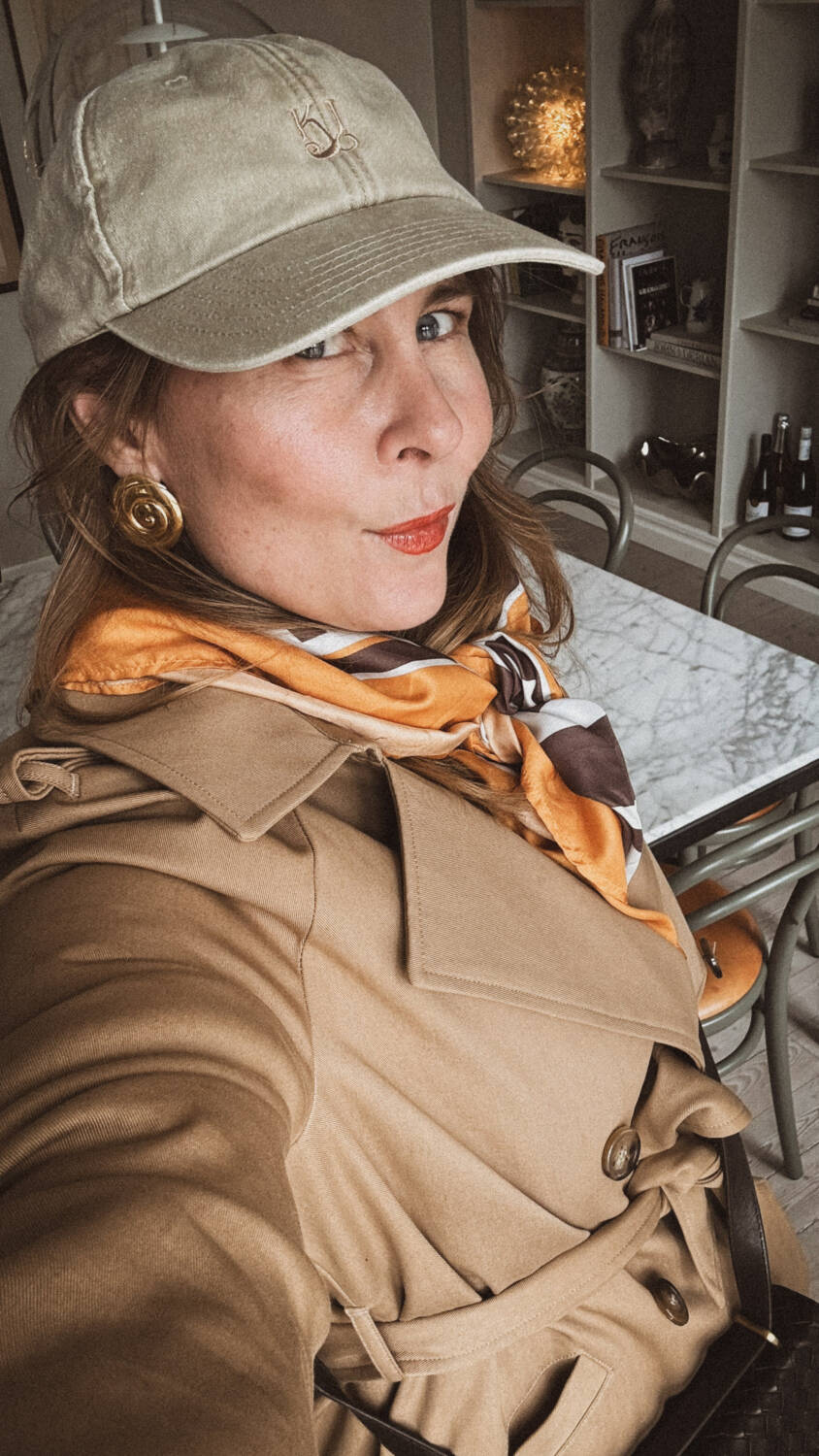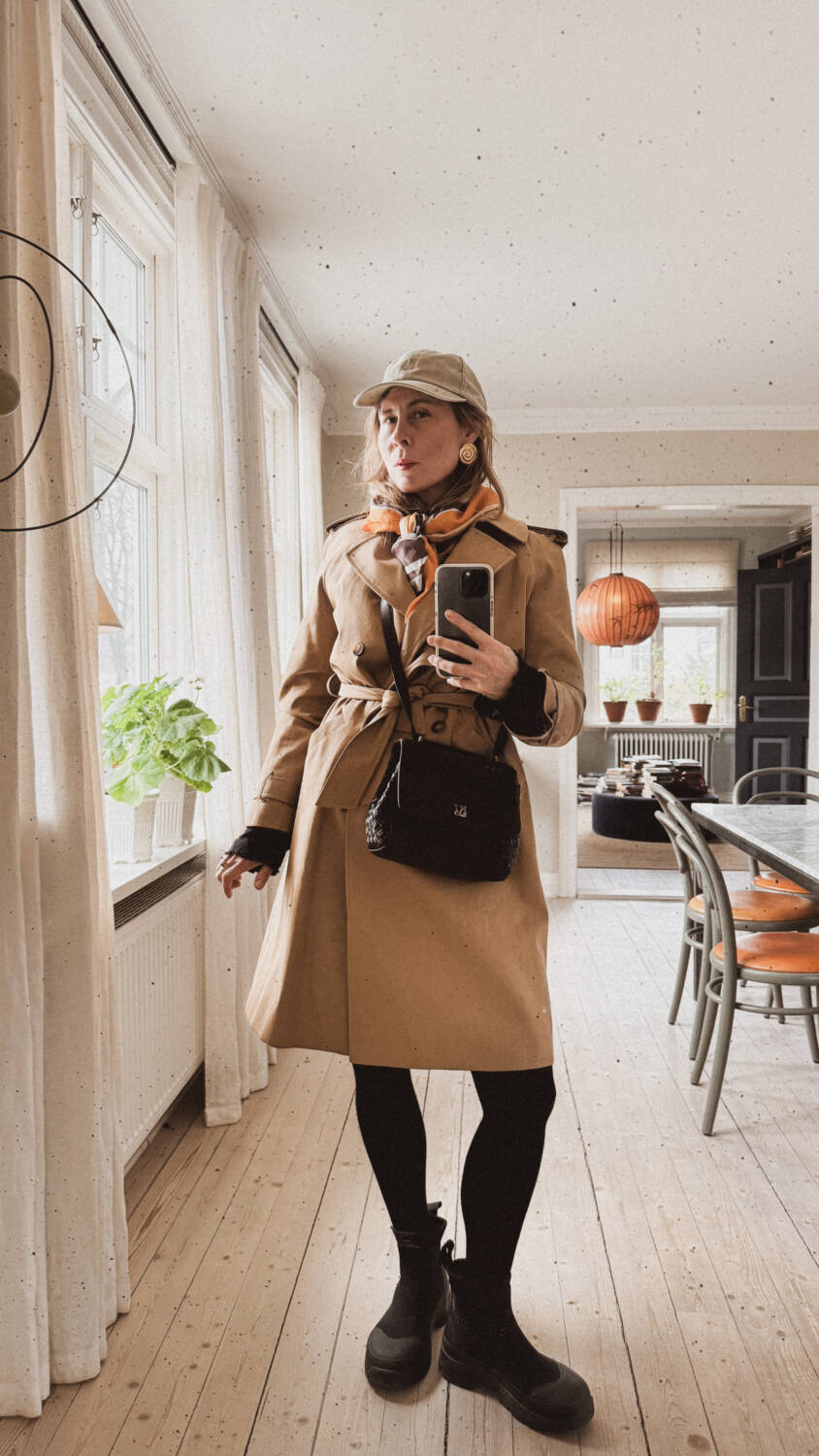 En riktigt vårig kulör på keps, Trench Coat från Zezane, scarf i silke och vår fina flätade väska. Skorna är otroligt bra och jag fick ett tips från Emily Slotte att köpa dem. Väldigt användbara vattentäta låga hybridstövlar från Arket. (reklamlänk)
