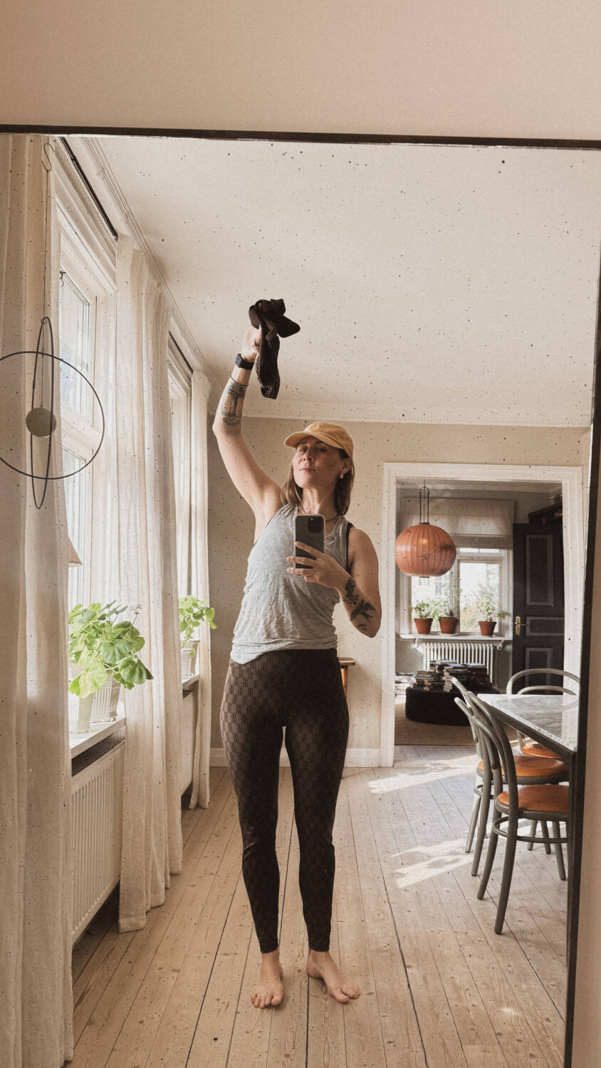 Ny dag och annan outfit. På väg till träningen. Tights från By Malene Birger, pilates sockar i hand och gul keps på huvudet. Jag gillar att ha sportbh på för då blir min byst intryckt och mindre. Kanske ska börja använda på heltid. Har kollat upp en eventuell bröstförminskning men det var så dyrt så jag tycker inte det var värt det.
