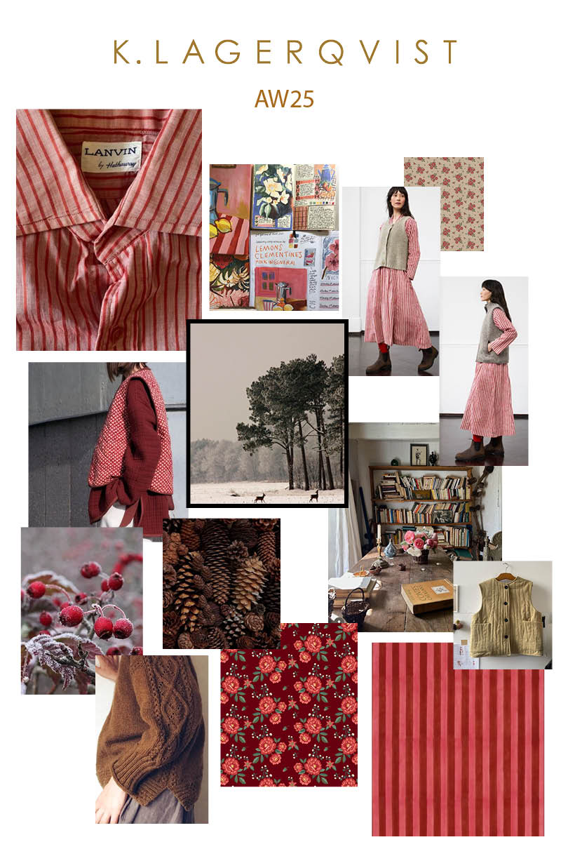 Så här såg moodbord för vinter ut och ur den skapades olika designs av de tyger vi vävt ränder och tryckt mönster på. Jag ville ha ett småmönstrat tyg med buketter av vackra blomster på vinröd botten. Hanna Wendelbo satte min vision till liv och skapade de mest fantastiska Liberty liknade mönster som känns både klassiskt och juligt på ett behagligt vis.