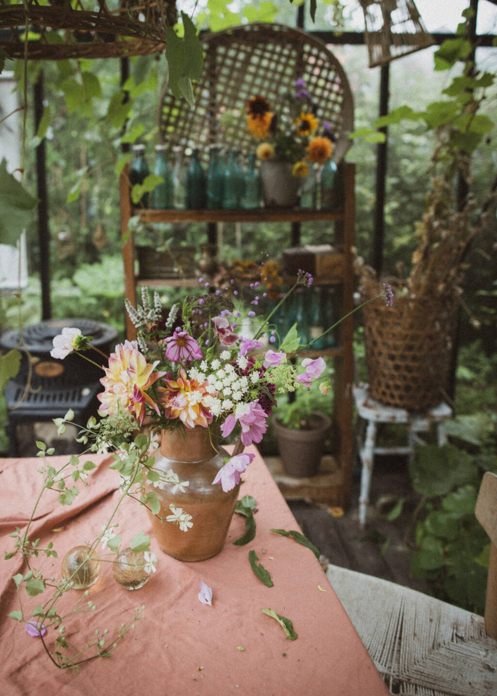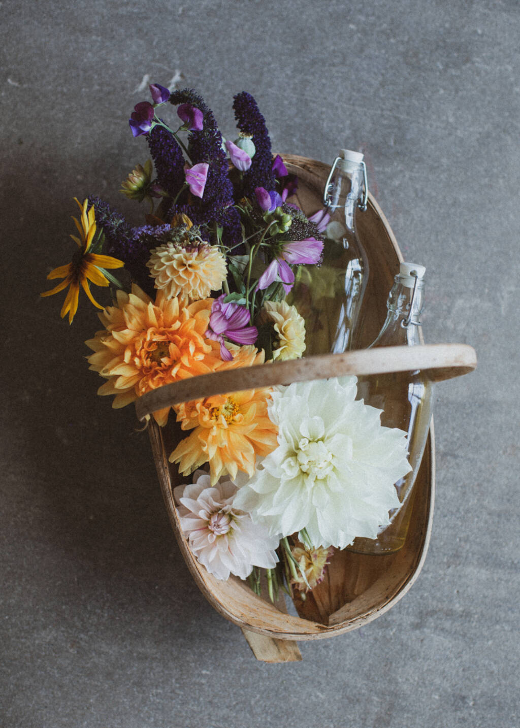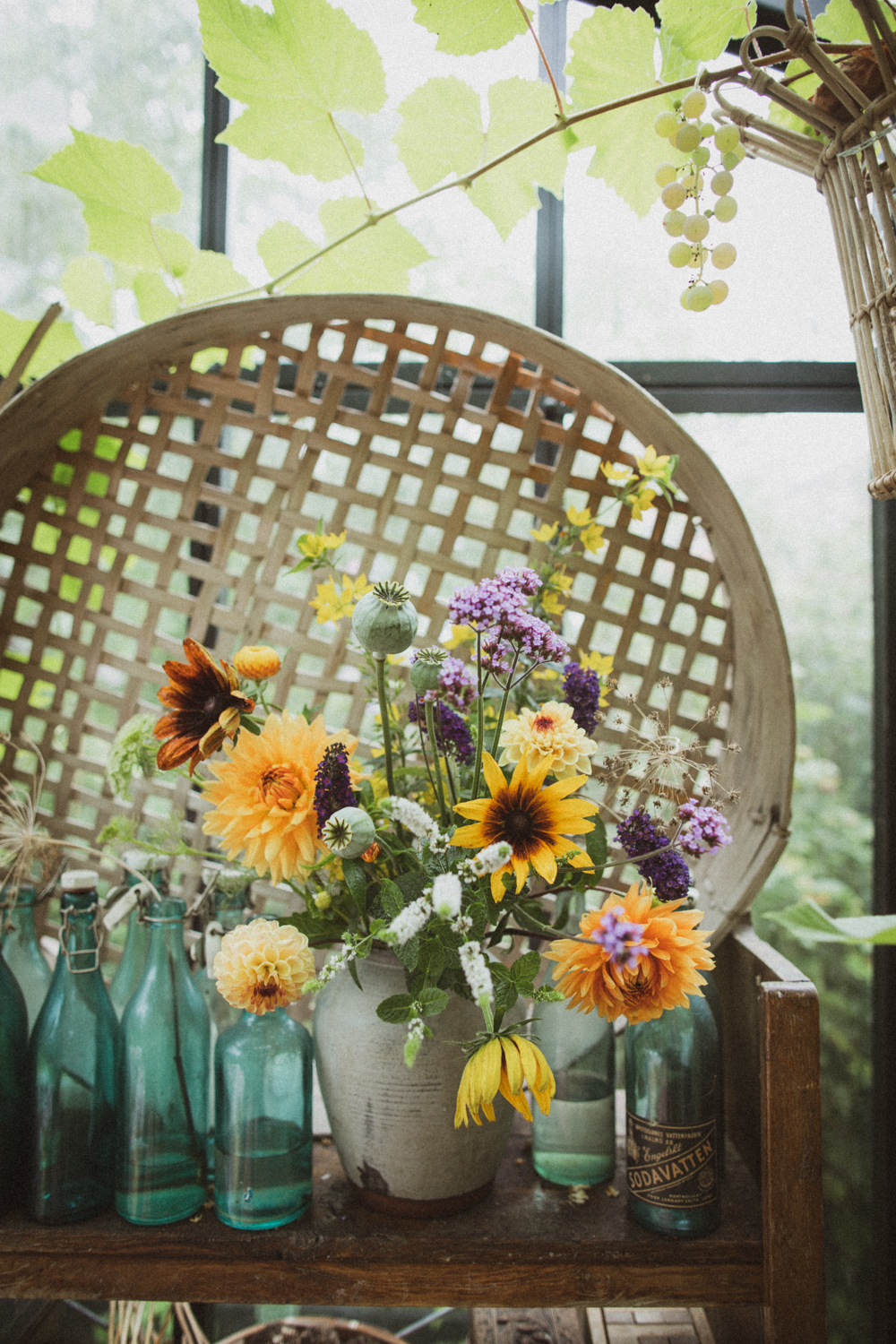 När Hanna plockar snittblommor så har hon med sig en hink vatten som hom låter blommorna suga i sig av någon timme innan hon börjar jobba med dem – det är ju smart. Jag klipper rakt av och grejar direkt med blommorna, då blir de såklart lite chockade och ledsna. Det kan man se på den gula som var utan vatten i en halvtimme… Men nu har alla hämtat sig och buketterna här hemma är väldigt vackra.