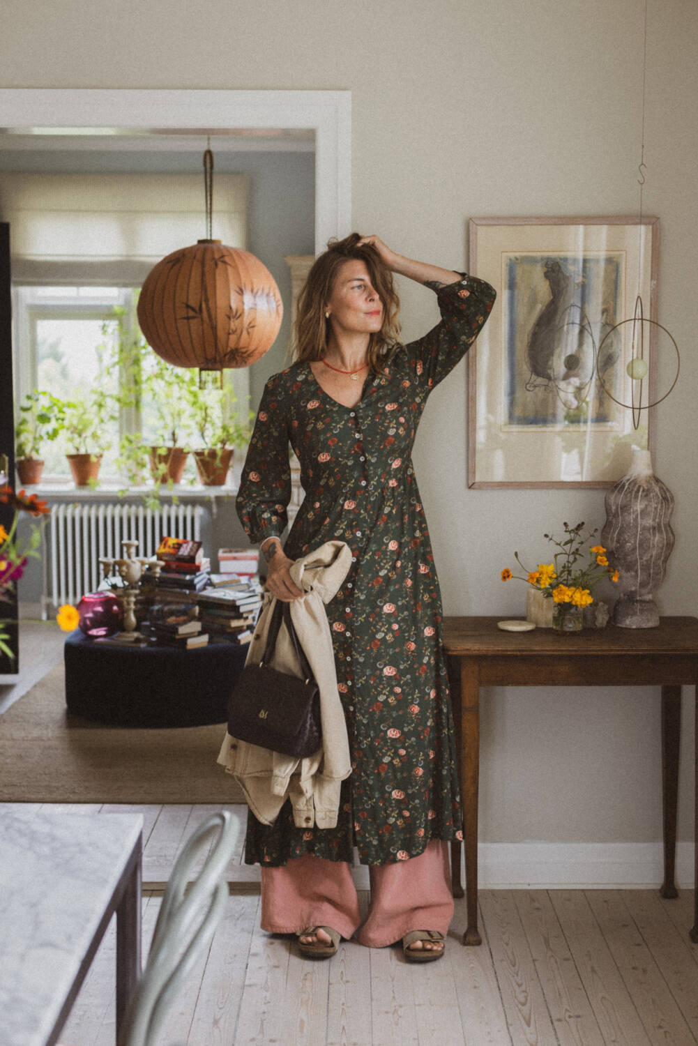 Jag tycker det är så fint att kombinera byxor med en långklänning när det är kyligt – det ger klänningen en lite cool och nedklädd känsla. Häromdagen bar jag just den kombon, men när solen tittade fram vid lunch och temperaturen steg, så åkte byxorna av och klänningen bars ihop med ett par röda ballerina istället för tofflor.
