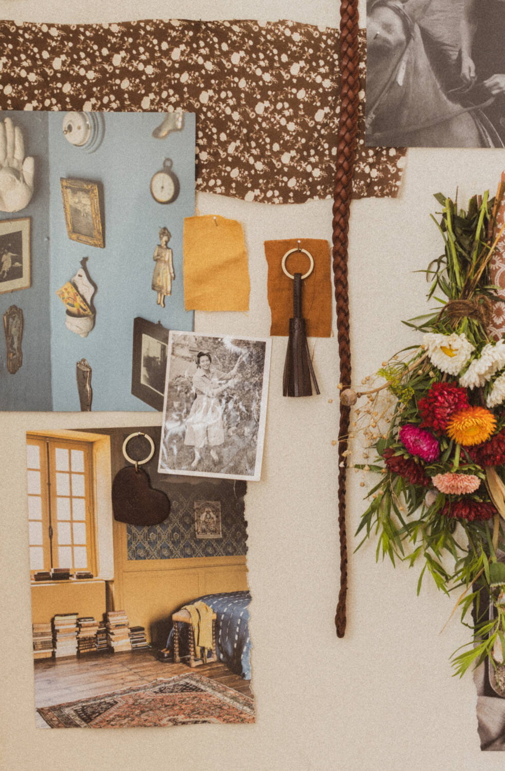 Man tager vad man haver. Utrivna boksidor, små tygbitar från kommande kollektion, små läderdetaljer, ett tack-kort och buketten jag fick av Carro kvällen innan.