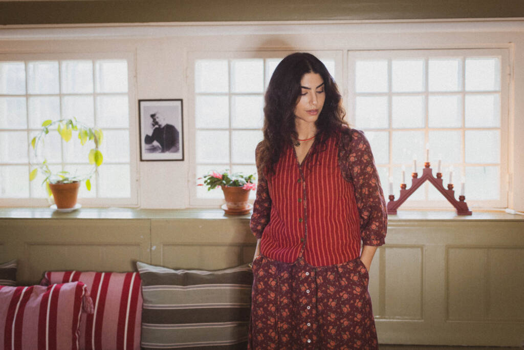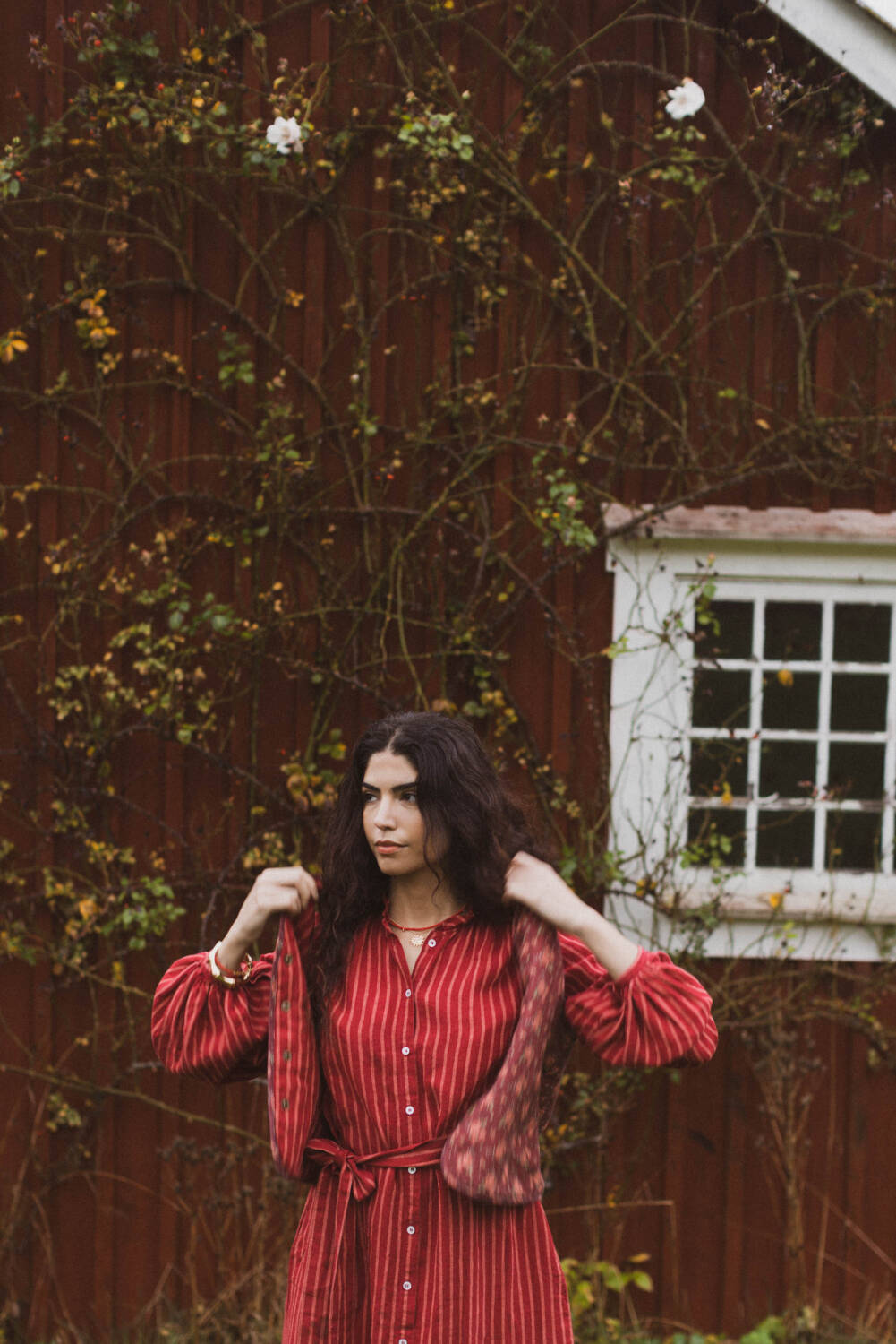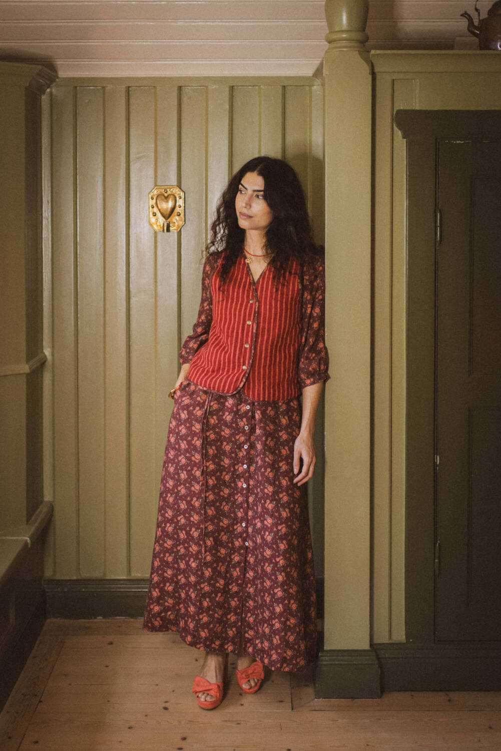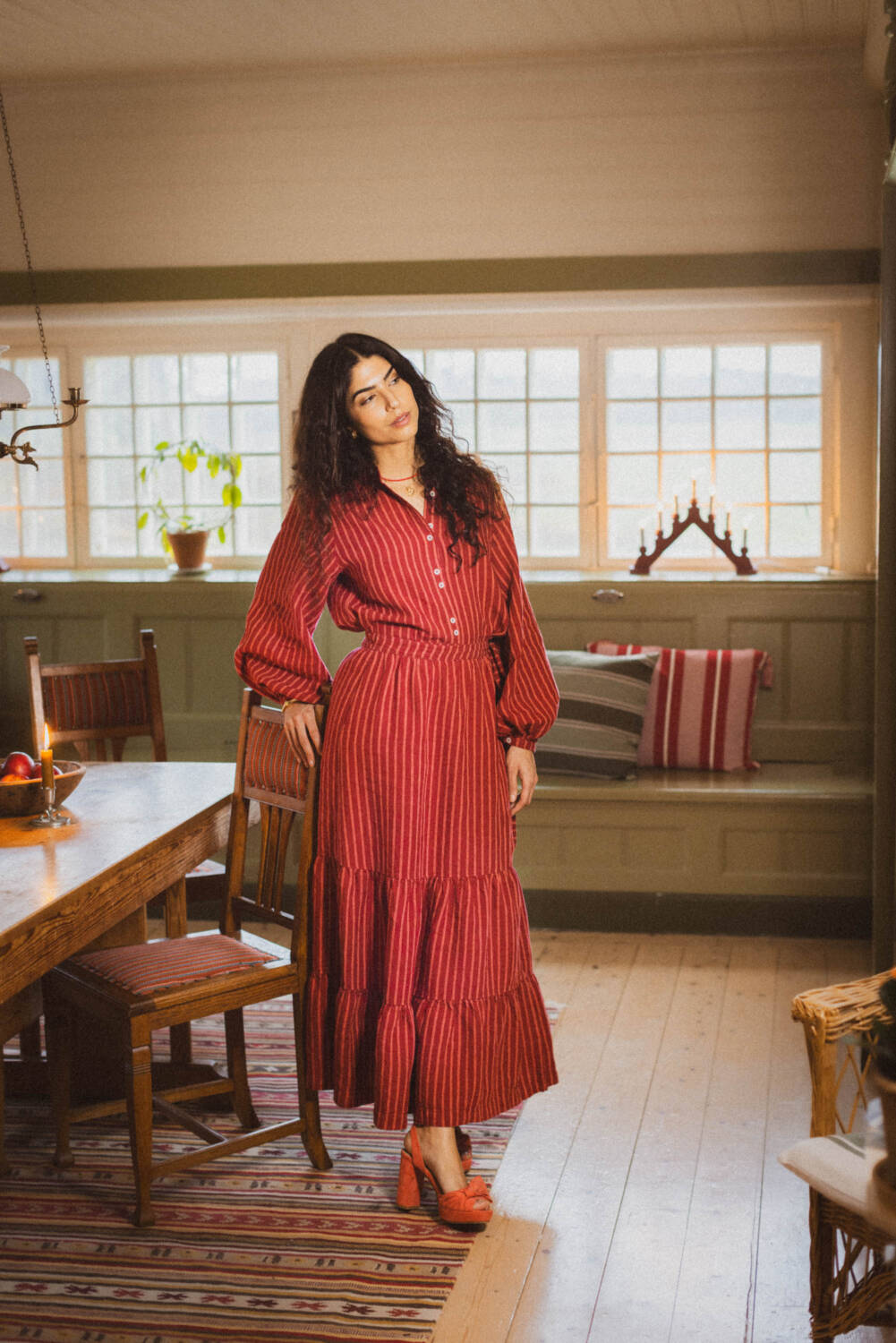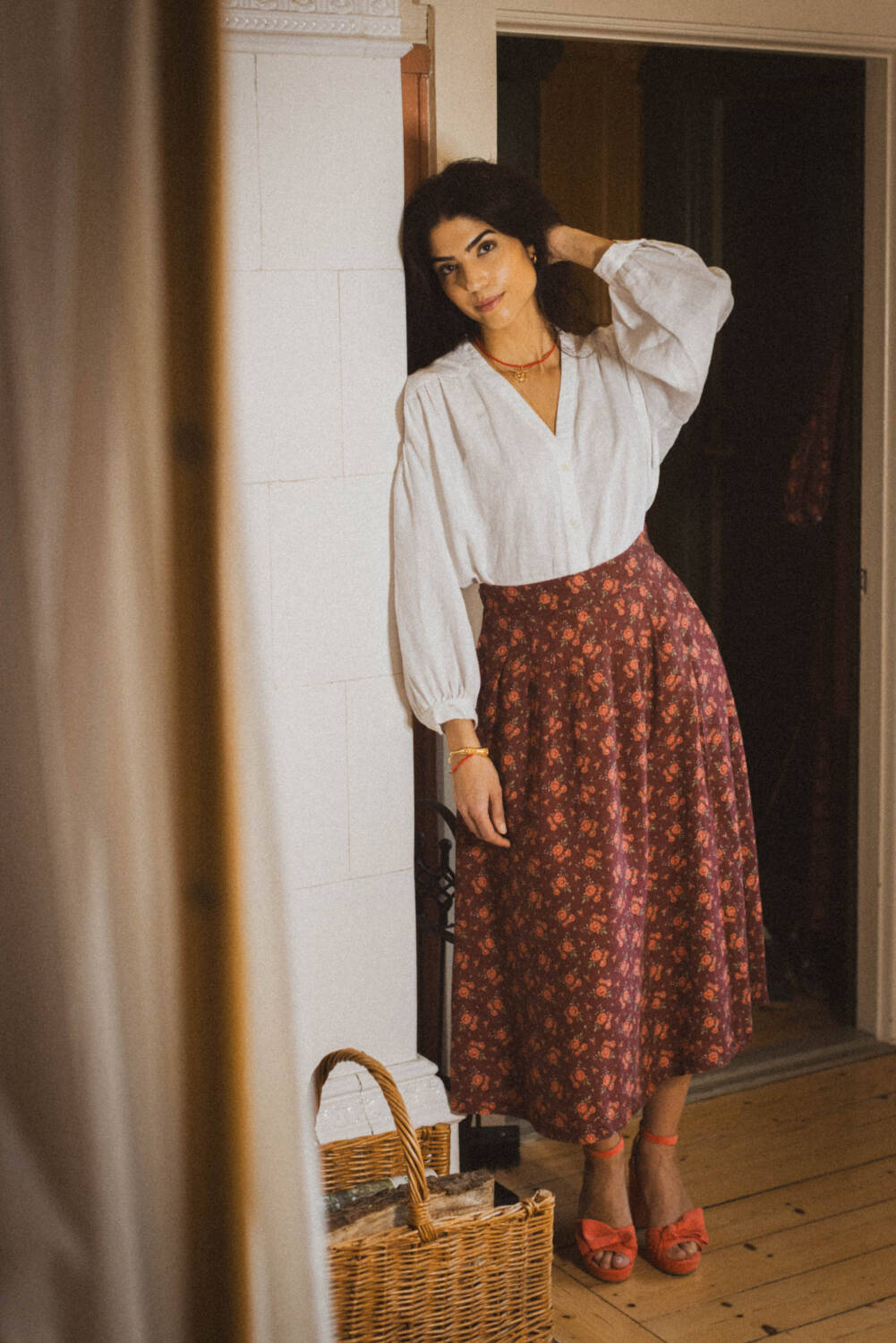 Vi har sytt upp mönstret i kjolar, klänningar, blusar och västar. Allt i 100% franskt lin.