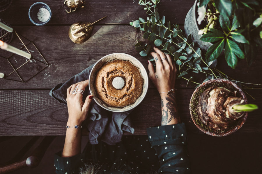 Grädda i cirka 40 minuter i ugnen. Ta ut, vänd upp kakan på ett fat och låt svalna.